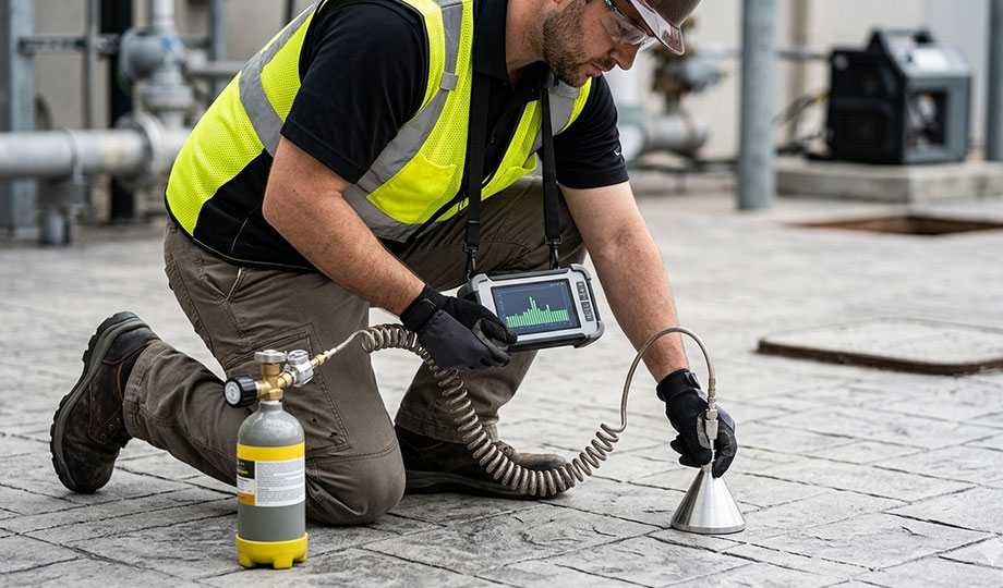 Cuando la acústica falla (por bajo flujo o mucho ruido ambiental) o la termografía es insuficiente (mucho aislamiento), utilizamos el método del gas trazador. Inyectamos una mezcla de gas inerte (Nitrógeno e Hidrógeno), completamente segura, no tóxica y apta para agua potable, dentro de la tubería sellada. Al ser la molécula más ligera del planeta, el hidrógeno escapa incluso por microfisuras y sube a la superficie de forma vertical.